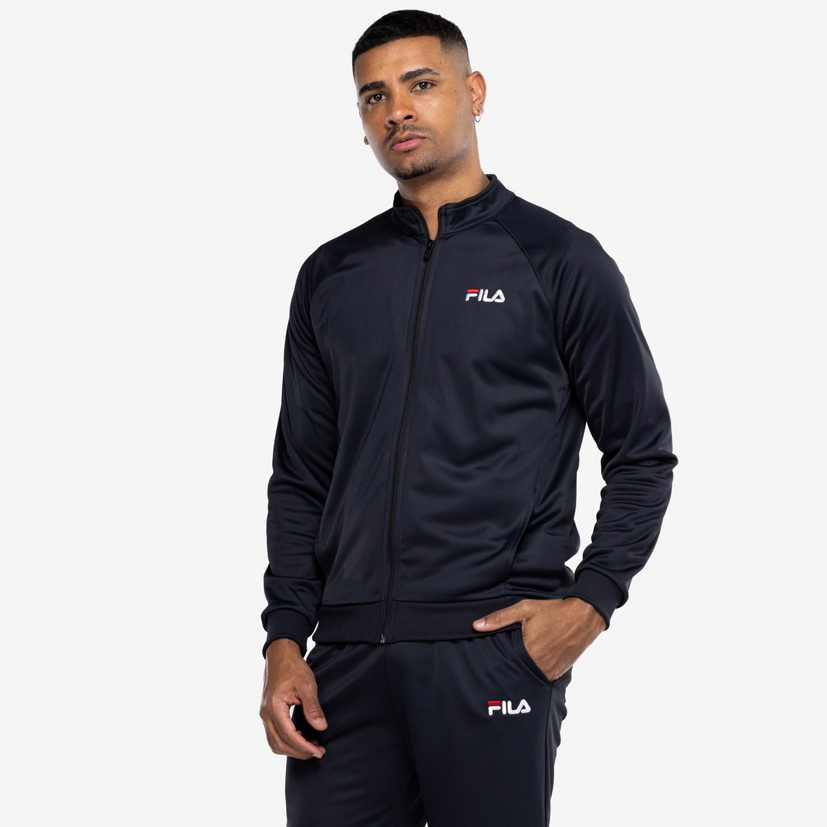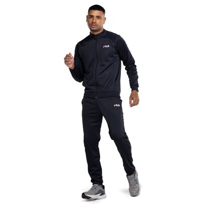 Conjunto de agasalho masculino confeccionado em malha de poliéster. A jaqueta possui abertura frontal em zíper com capinha, gola alta, manga longa raglan, punhos e barra em ribana, bolsos frontais embutidos na costura lateral deslocada para frente e logo Fila Letter bordado na parte frontal esquerda superior. Calça com modelagem regular, cós com elástico e amarração interna ajustável, bolsos laterais, barra de elástico e logo Fila Letter bordado próximo ao bolso esquerdo.