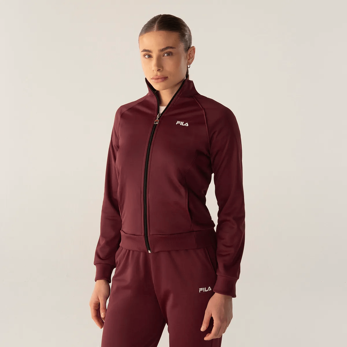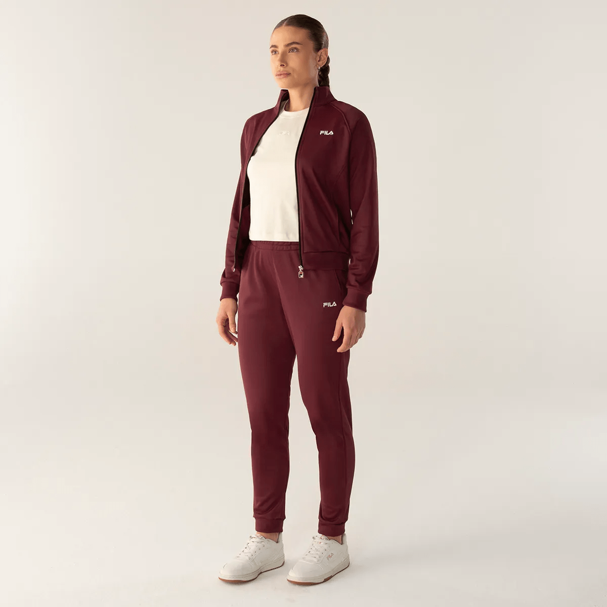 O Agasalho Feminino FILA Essentials combina design casual e esportivo. A jaqueta, em modelagem regular, apresenta mangas raglan com vivos contrastantes, bolsos frontais embutidos e acabamento em ribana na barra e punhos, além de tape gola com pesponto. A calça, de modelagem ajustada, possui cintura com elástico e cordão interno para regulagem, além de bolsos frontais tipo faca. Fabricado em malha de poliéster, o conjunto oferece estilo e conforto.