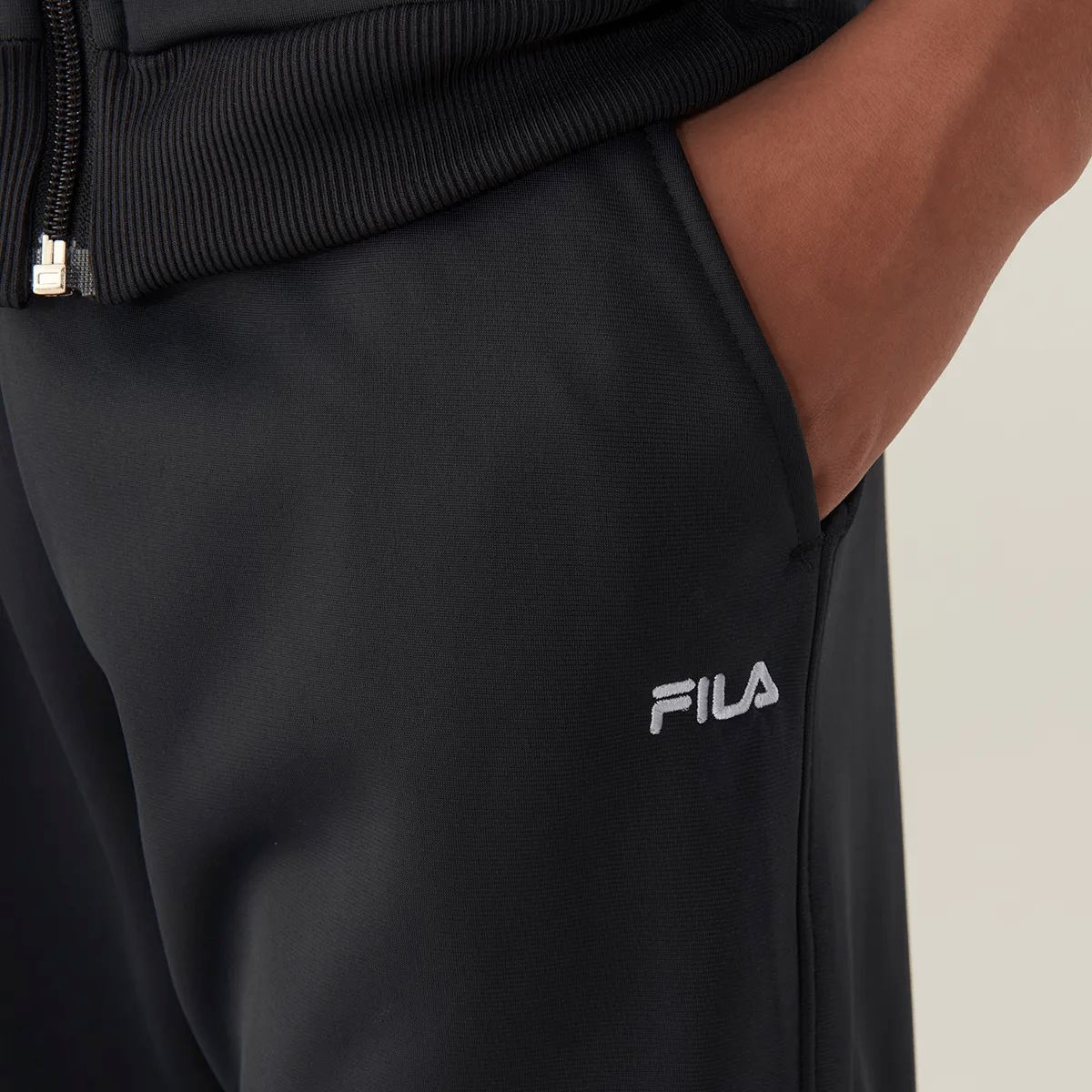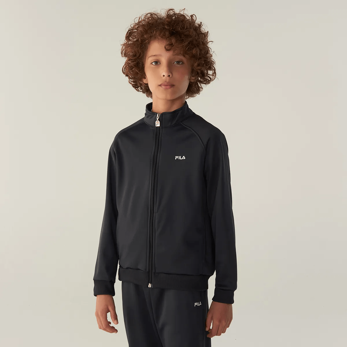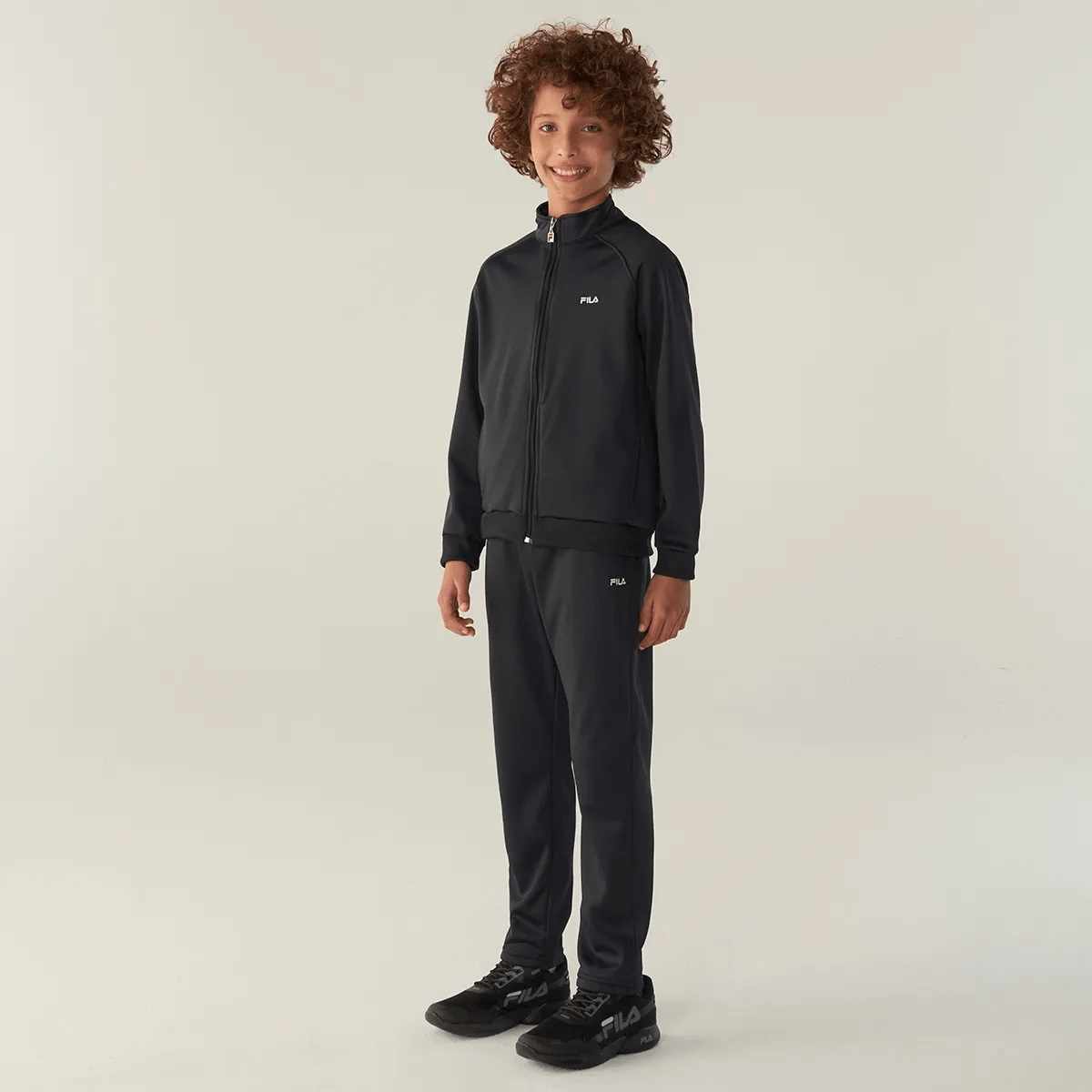 O Agasalho Junior Masculina FILA Regular Letter Icon é confeccionado em malha helanca de poliéster sustentável. A jaqueta possui modelagem com mangas raglan, gola alta, recorte lateral deslocado para a frente e bolsos frontais alinhados ao recorte, além de barra e punhos em ribana. A calça acompanha o conjunto, com bolsos laterais travetados, cós elastizado e ajuste interno por cordão. O FILA Letter bordado no peito esquerdo da jaqueta e na calça finaliza o design.