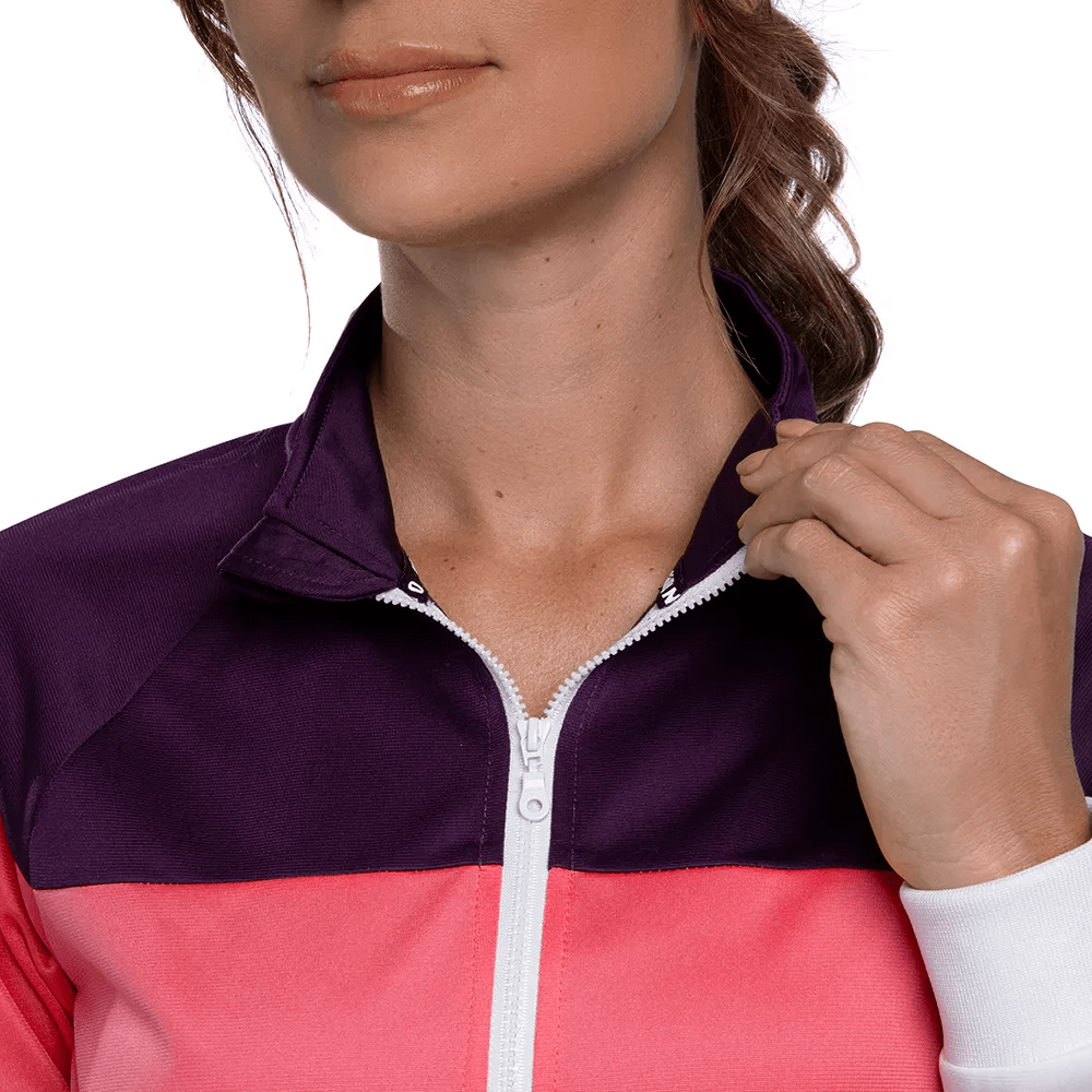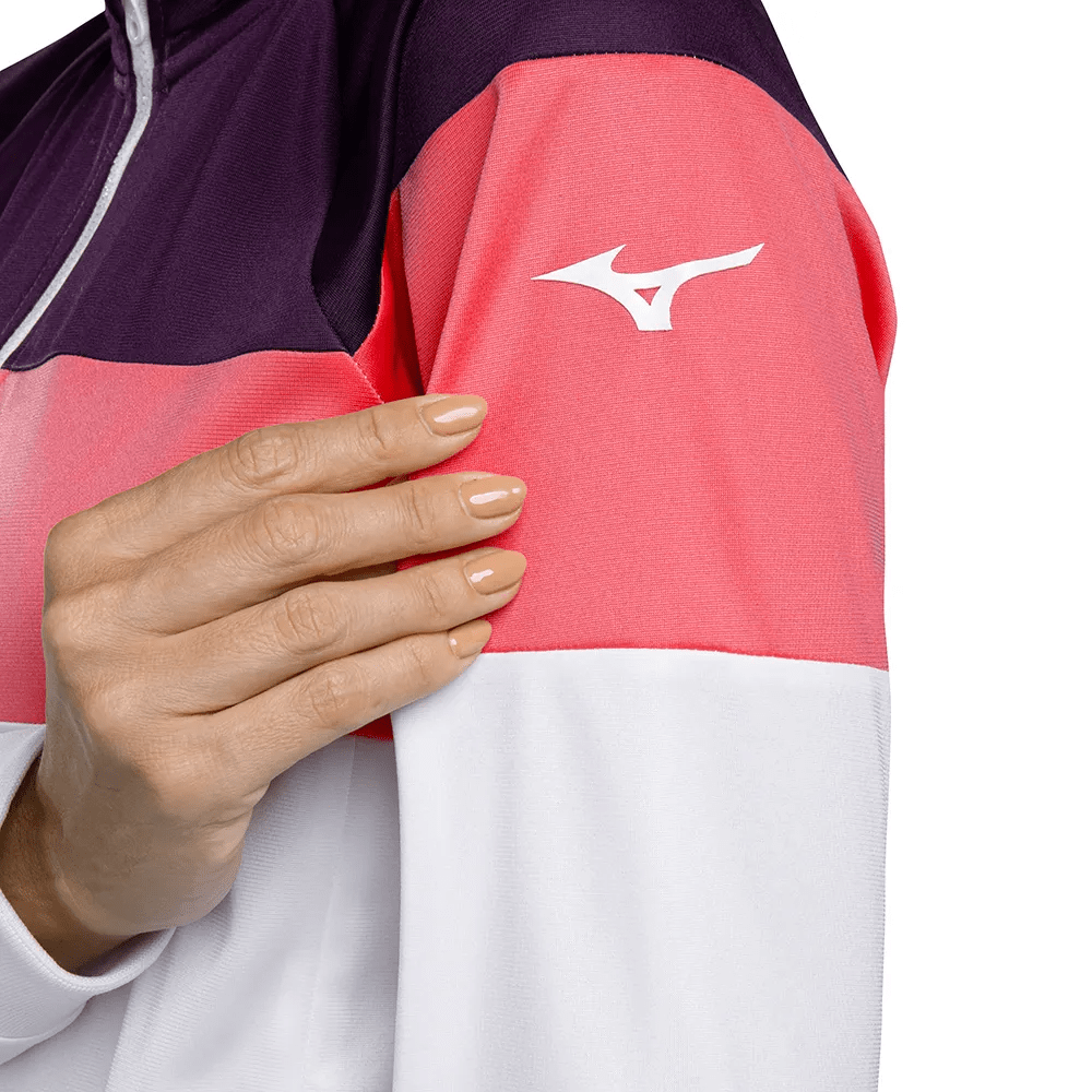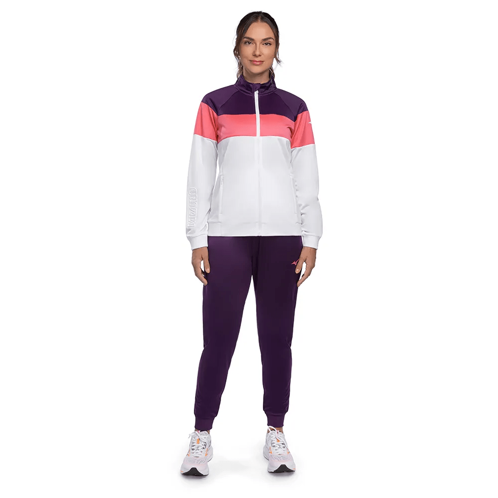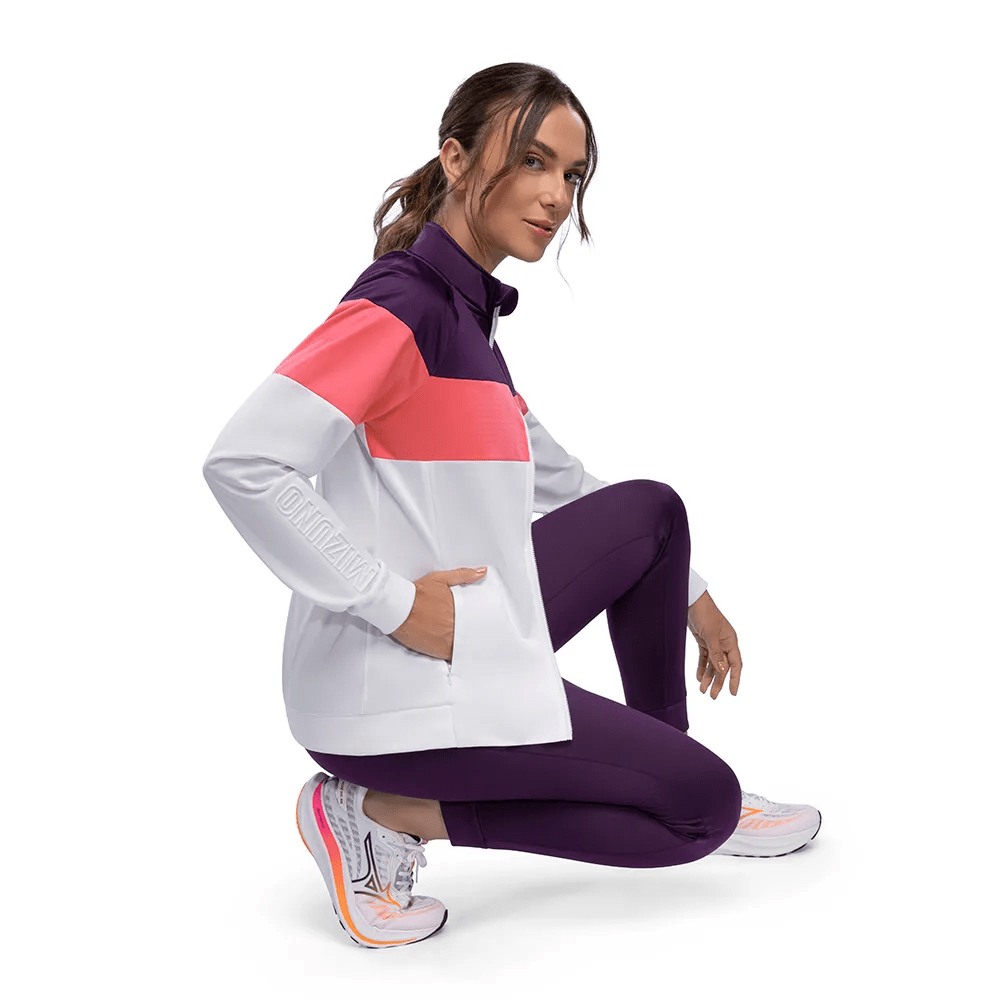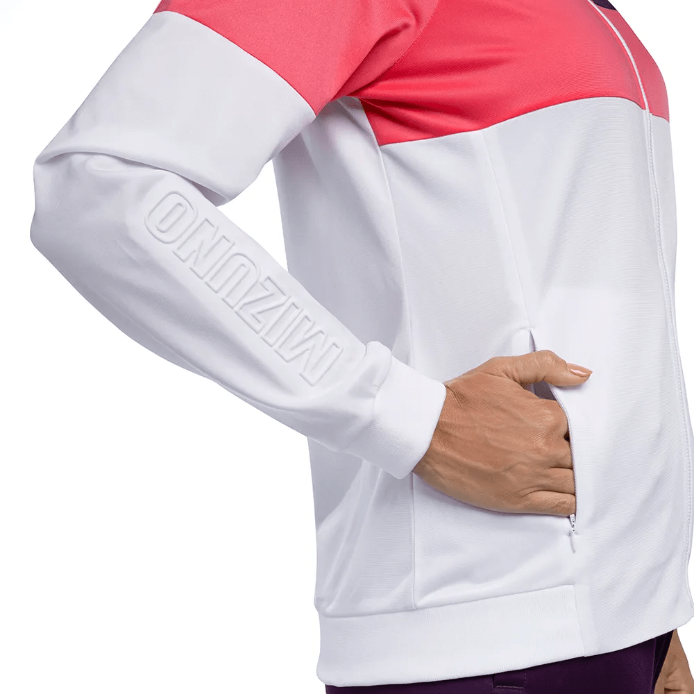 Agasalho em malha de poliéster com modelagem levemente ajustada. Gola alta e punhos em ribana. Bolsos frontais na jaqueta com abertura de zíper. Recortes contrastantes para um efeito bloco de cor. Logo bordado e lettering Mizuno em alto relevo na manga da peça.