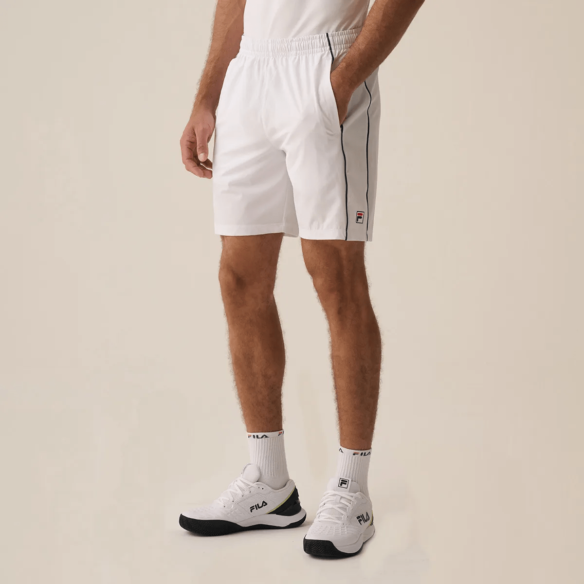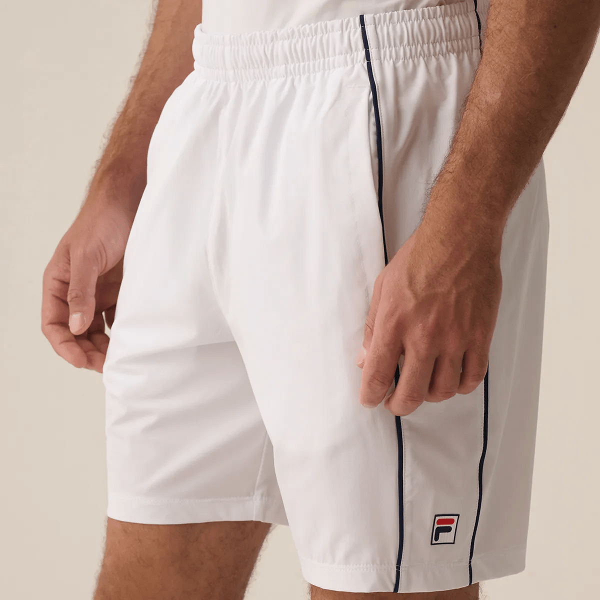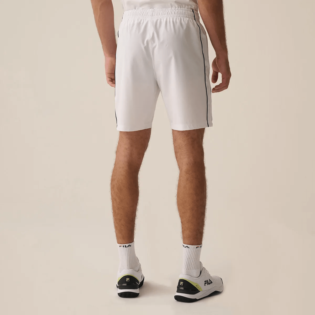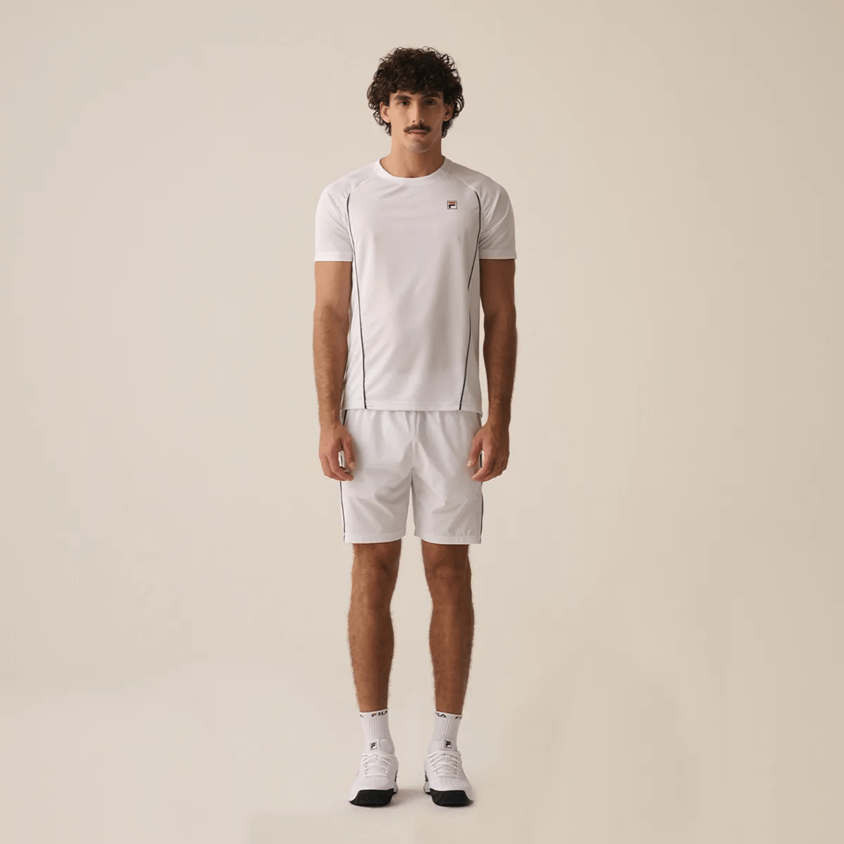 A bermuda da FILA para jogar tennis possui recortes curvados nas laterais com vivos contrastantes e bolsos laterais forrados em tecido atoalhado. O cós com elástico interno e cordão oferece maior segurança e conforto. A peça também conta com logo F-Box na lateral, adicionando um detalhe esportivo e moderno