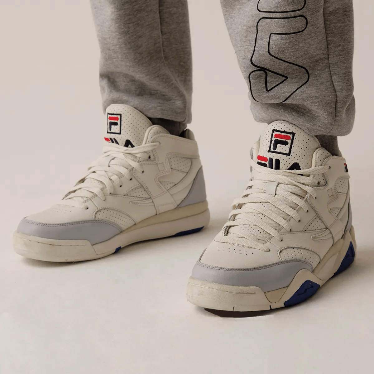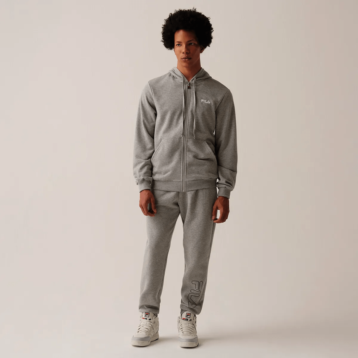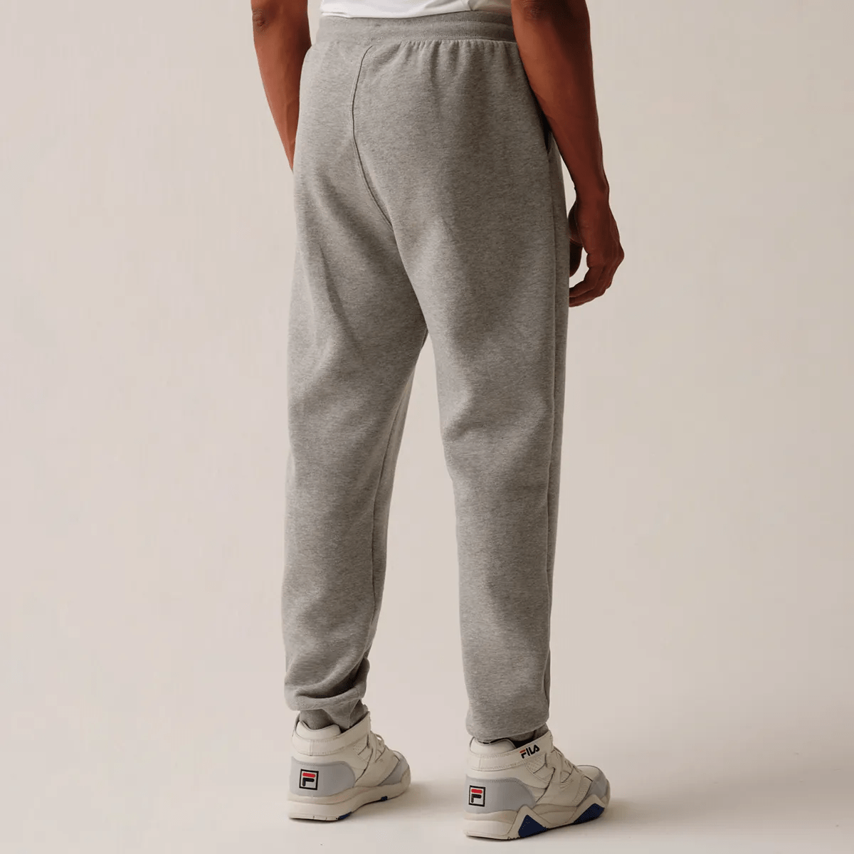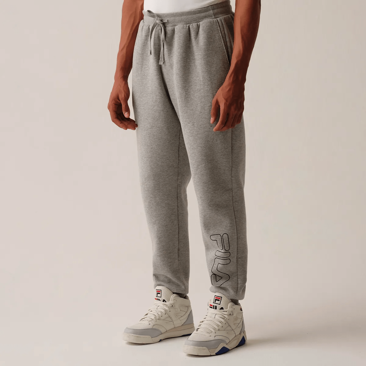 Calça masculina confeccionada em moletom com felpa. Modelagem regular com cós em ribana e cordão de ajuste externo. Possui punhos da barra em ribana, bolsos laterais pespontados com travetes nas extremidades e maxi logo Fila Letter Outline vertical em silk na parte frontal inferior esquerda. Comprimento total: 102 cm.