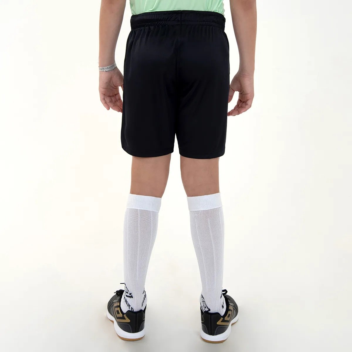 Calção juvenil confeccionado em poliéster na modelagem regular. Possui cós com elástico tombado de 4,5 cm e cordão de ajuste com amarração interna, além de canaleta pespontada no cós e gancho com costura reforçada. O logo Umbro contrastante em termo é aplicado na parte frontal esquerda próximo à barra.