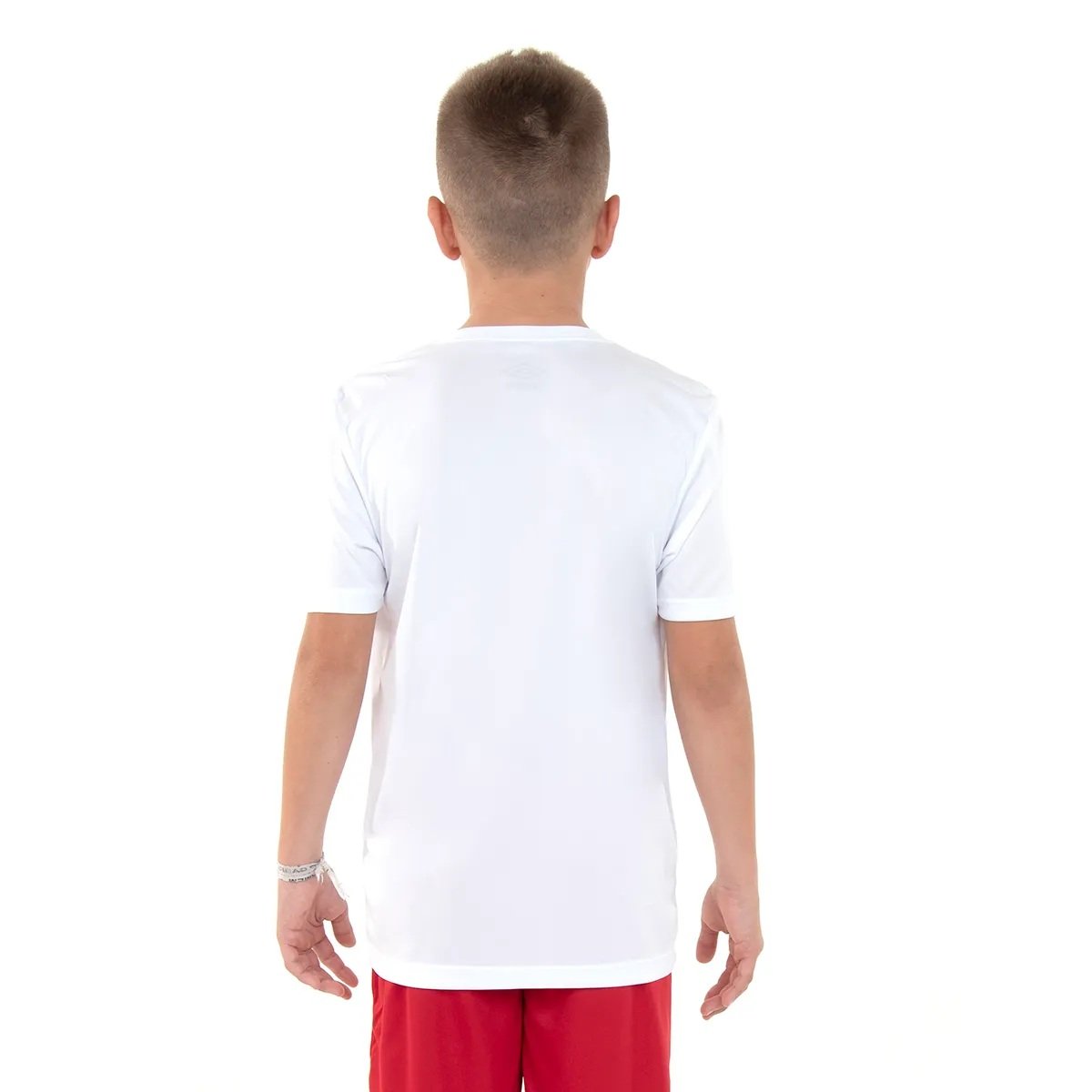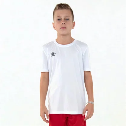 Camisa juvenil confeccionada em 100% poliéster. Modelagem regular com manga curta. Possui gola careca em ribana e logo Umbro em termo aplicado na parte frontal direita superior.