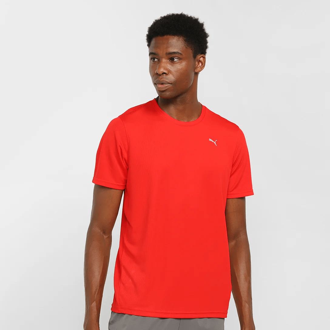 Camiseta masculina básica com costura lateral deslocada para frente para melhor vestibilidade. Tecido de malha texturizada em canaletas 100% Poliéster. Tecido com tecnologia Drycell: Tecnologia PUMA de alta performance com propriedades de absorção de umidade que mantém o corpo seco durante o treino. Logo PUMA do lado esquerdo do peito com tecnologia refletiva.