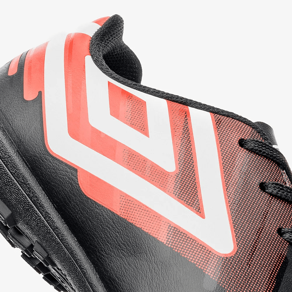 Cabedal confeccionado em material laminado de fácil limpeza e manutenção. Possui grafismos em “layers” com aplicação de verniz incolor sobre as artes, Diamante Umbro em destaque na lateral, assinatura do modelo na parte frontal e palmilha interna macia em EVA com tecido forrado. O solado de society HG é composto por blenda de PVC e TPU, que oferece aderência ao solo e durabilidade.
